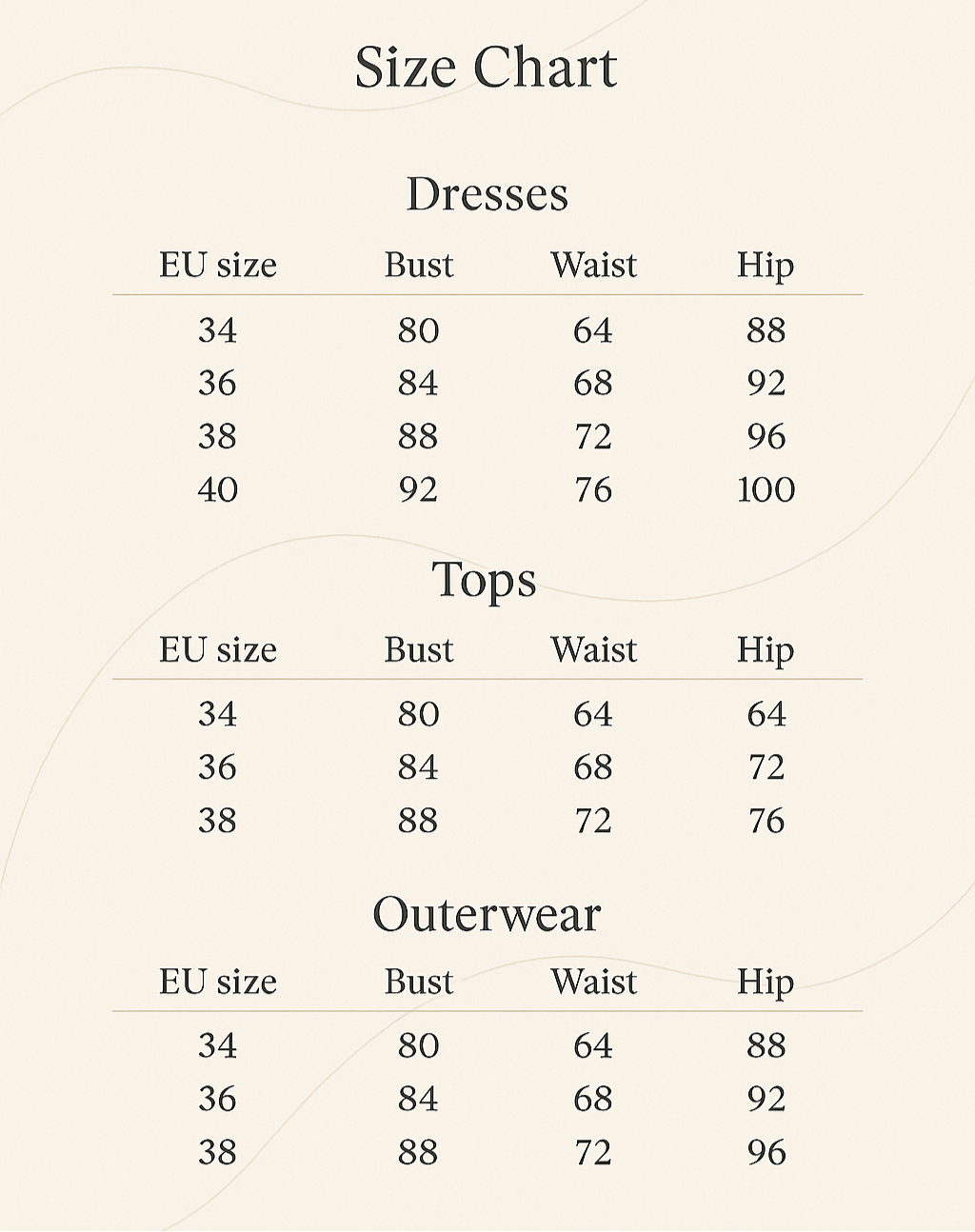 At Butter, every garment is crafted with precision to accentuate elegance and movement. To ensure the perfect fit, please refer to our sizing guide.